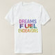 This t-shirt features a vibrant and inspiring design with the text "Dreams Fuel Endeavours" in a bold, artistic font. Each word explodes with a different colour, creating a dynamic and eye-catching display against a clean white background. The text is centred and formatted for optimal readability, making a powerful statement about the transformative power of dreams that ignite our pursuits.