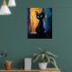 A black cat with large green eyes, seated against a vibrant abstract background that shifts from warm yellows to cool blues. The expressive brushstrokes and emotional gaze give this feline portrait a magical, storybook quality. Perfect for cat lovers and collectors of imaginative art.