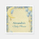 A dreamy watercolor design featuring a glowing crescent moon surrounded by hanging stars, fluffy clouds, and festive balloons in soft shades of blue and gold. Perfect for creating a magical and celestial-inspired baby shower atmosphere.