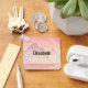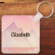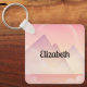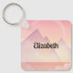 A keychain with a lovely charming illustration. Pastel colours of pink and peach. Landscape scene with planets, mountains and clouds.