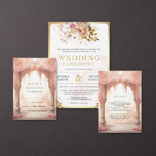 Amaze your guests with this elegant all in one Indian wedding invite featuring beautiful arches decorated with curtains and pink flowers. Modern gold typography with QR Code for online RSVP. Simply add your event details on this easy-to-use template to make it a one-of-a-kind invitation.