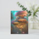 Beautiful dreamscape with a multi-level pink treehouse at night. Digital art postcard design generated using AI software.