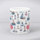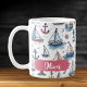 This personalised mug features playful sketches of sailboats, anchors, and lighthouses with bright pastel watercolor textures in light blue, lavender, and peach to fill some elements, adding a soothing, dreamy aesthetic.