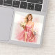 A beautiful woman in a flowing pink dress holds a bouquet of flowers and a pair of high heels in this elegant watercolor illustration.