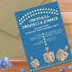 These Hanukkah dinner party invitations are made special with accents of real gold foil printing and your personalised text. Designed on a background of rich medium dark blue, the main theme is three rustic dreidels on the bottom in a faux oak wood graphic above a row of real foil polka dots. The theme of dots continues on these personalised Hanukkah party invites with a double row at the top of the design and a single row down the centre. COCKTAILS DREIDELS & DINNER in a simple block font is also printed in real gold foil and can be edited by you if you wish. The remainder of the text on these Chanukah invitations is in white and give you three areas to personalise with your party details. Each invitation card reverses to a light sky blue with deep blue polka dots.