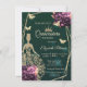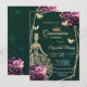 Gold glitter tiara, dress, butterflies, stars, and violet roses on a green background. Invite guests to join you in celebrating this milestone with a design that reflects the magic and joy of your quinceañera.