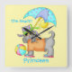 Let this dog tell time with this whimsy wall clock featuring dog art and a customised name or dog name. Great gift idea. This cute grey (grey) dog is ready for fun time at the beach with a colourful beach ball and a turquoise and lavender beach umbrella. Wearing cool yellow sunglasses, fuchsia and turquoise flip flops, orange beach tee shirt and a purple and green beach hat, she's ready to go, dressed in style. The background is yellow. Fully customisable for a name to personalise and customisable words "The Beach" can be changed to other words of your choice. The sun is out and shinning for a perfect day and she or he is ready for you to toss the ball. The dog breed fits with terrior or other small grey dogs with medium to long hair. This design is cute for all dog lovers and is original art by artist and fabric designer Phyllis Dobbs. Fully customisable.