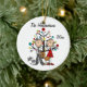 A pretty round ceramic keepsake 1st Christmas Together ornament features a stick figure couple all dressed up, him with a shirt and tie, her in a red dress, with dog and a cat, standing in front of the Christmas tree. Easily add your names and the current year to personalise it!