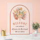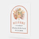 Design a beautiful translucent frosted acrylic wedding welcome sign that features a tropical flair by adding dried palm leaves, pampas grass, and protea flowers in lovely terracotta pink and beige tones. The arch frame, in terracotta colour, perfectly enhances the lively hues of the botanical accents. This distinctive blend of textures and colours will undoubtedly serve as a stunning focal point for any wedding celebration.