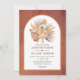 Tropical dried palm leaves, pampas grass and protea flowers terracotta arch wedding invitation. This lovely wedding design features an arch frame on terracotta stained background. In the frame there is a bouquet of dried palm leaves, protea flowers and pampas grass.