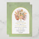 Sage green arch real gold foil wedding invitation with tropical dried palm leaves, pampas grass and protea flowers. A gold foil arch frame is placed on a sage green stained background. A bouquet of dried palm leaves, protea flowers, and pampas grass is displayed in the frame.