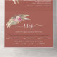 Dried pampas grass and palm leaves terracotta boho all in one wedding invitation. A lovely floral design for your wedding that showcases bouquets of dried pampas grass, palm leaves and roses, the couple's initials and the names in script typography on terracotta brown background.