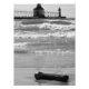 A single piece of driftwood in on the shoreline of Lake Michigan at St. Joseph, Michigan. The St. Joseph lighthouse is in the background.