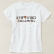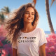 A Tee that evokes summer surf, sand and sun, written in bits of driftwood with a float ring, a surf board and a bicycle leaning on the words. Memories of summer holidays at the beach.