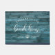 Modern, chic brush script reading WELCOME TO OUR BEACH HOUSE in a trendy typography driven design. Great custom beach house decor for your home away from home. Both romantic and stylish, our turquoise printed driftwood door mat features a sweet shell illustration between your location and the year established.