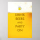 Drink Beers and Party On Beer Poster Print. A beer joke poster with a glass pint of beer and fully customisable text slogan "Drink Beers and Party On" against a beer background. This great beer parody poster print is fully customisable, add your texts and images! A great beer gift for the big beers fan!