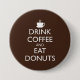 Fun button for coffee and doughnuts lovers with a coffee cup with "DRINK COFFEE AND EAT DONUTS." Design based on the 1939 British morale poster "Keep Calm and Carry On". For coffee lovers.