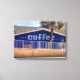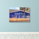 “Drink COFFEE sleep later” - In worn white letters on a cobalt blue background painted on a brick wall, the sign in the original photograph by ZoeSPEAK on this Canvas Print says it all to coffee lovers. The little shop, with a palm tree in front and a thatched roof behind, is basking in the afternoon sunlight.