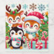 Penguins in Santa hats, smiling Rudolph, and polar bears in scarves are creating a joyful atmosphere in a background full of Christmas trees, gift boxes and snowflakes.