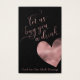 The background of this elegant drink ticket can become any colour you choose. In an elaborate script font, the words "let us buy you a drink" appear on the front of this modern drink ticket. The beautiful text has been embellished with a rose gold faux-foil effect. "Good for One Adult Beverage" was added as an editable text field in a complementary serif font at the bottom. Use any other words you like if you want to change the copy. On the back the beautiful graphic text overlay reads "cheers" and a template place holder was added for your names. On both sides a matching, asymmetrical, rose gold heart peeks in from the edge. The editable background is black in this example; change it to any colour you prefer. All layers are unlocked so you can resize or re-position any part of this card that you like, should you want to tweak the design. Please do not hesitate to reach out if you have requests or need customising assistance.