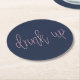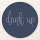 Navy blue background with blush handwritten bouncy font on a custom script "drink up"