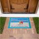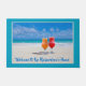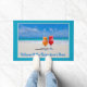 Welcome doormat with tropical scene.  Two cocktails sit on the beach sand with tropical blue water behind.  Customise the text at the bottom of the image to "welcome" guests, or use the template for the family name.  A turquoise blue border frames the design.  Choose either size.