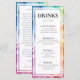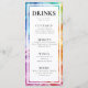 Introducing the slim drink menu card from the "Ethereal Bloom Collection," a vibrant and artistic addition to your wedding reception. At the top of the card, against a backdrop of mesmerising alcohol ink artwork with swirling hues of blues, purples, reds, oranges, and greens, the caption "Drinks" is elegantly displayed. The couple's names and the wedding date are featured prominently, adding a personal touch to the design.