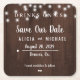 Simple rustic casual Drinks on us! white typography script, name, date, and place personalised wedding save the date coaster on a dark brown barn wood with string lights background.