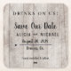 Simple rustic casual Drinks on us! black typography script, name, date, and place personalised wedding save the date coaster on a natur barn wood with string lights background.