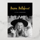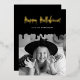 Send eerie Halloween greetings with this spooky photo card featuring “Happy Halloween” in gold foil hand-lettering. The top of the design showcases speckled black “blood” dripping over your personalized photo for a bold, horror-inspired look. Add your name to the front for a unique finishing touch. The back of the card features a matching speckled black background, creating a cohesive and striking Halloween design.