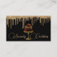 Elegant bakery business card done in black, with graphics of dripping gold, at the top, and a lovely dark red and gold cake, on the front. Personalise the pale gold coloured text, on the front and back of the card, to suit your business needs. Great for at home bakers too.