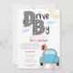 Drive By Baby Shower Invitation - perfect for a baby boy. Drive By honk and wave are lettered in whimsical typography with street illustrations and there is also a blue car with balloons. You can edit the poem and even the occasion if you wish, as well as customise with your name, date and drive thru party details. Sunny and cheerful design for a social distancing baby shower.