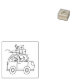 A moving cartoon car with a big-nosed driver in a baseball hat, a happy dog in the back seat, and a bunch of boxes and a cactus on its roof.
