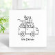 A moving cartoon car with a big-nosed driver in a baseball hat, a happy dog in the back seat, and a bunch of boxes and a cactus on its roof.