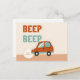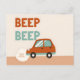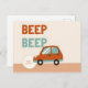 This charming postcard presents a delightful celebration of a significant milestone—passing a driving test. The front of the postcard is dominated by a playful, oversized typographic exclamation "BEEP BEEP" in alternating shades of warm russet and soft teal, evoking the sound of a car horn in a friendly and inviting manner. Below this jubilant proclamation sits a stylised, cartoon-like representation of a car, rendered in a cheerful shade of orange that conveys a sense of excitement and energy.