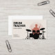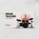 A business card for a drum teacher or a drummer. The illustration consists of a silhouette of a drum kit, a drummer with his hands highlighted, and a striped red-brown sun in the background.