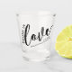 Calligraphy script "drunk in love" quote bachelorette party shot glass favour with the bride's name and party date in simple and bold black printing.