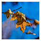 Closeup view of a dry oak leaf lit by March sunlight. Dark blue background. Keep calm, spring is coming.
