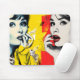Two women are depicted in a vibrant, pop art style, one in shades of blue and yellow and the other in grayscale with bold red lipstick. The background features a mix of abstract patterns in red and yellow tones.