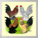 The mille fleur, self blue, brown red and buff Columbian roosters shown here are but a sampling of the lovely colours in which this pretty little bantam chickens are bred.