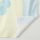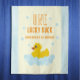 One lucky duck! First birthday featuring a rubber duck and bubbles against a light blue gingham and pale yellow background with orange text