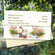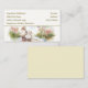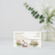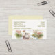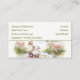 Ducks and pond business cards for duck owners and egg sellers. Add army green text, aligned to the right and left, over a duck pond image. Two white ducks stand in front of a pond with pink flowers growing at the edge. The back of the card is blank.