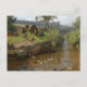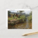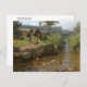 A postcard with the painting by the German artist Carl Jutz (1838-1916), A duck Family on the Weir. A river landscape with a mallard and duck family swimming. On the shore are a group of chickens. A weir is a low dam built across a river to regulate the flow of water.