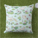 Make your couch extra special with this hand-drawn illustration of ducks with pink waterlily pads on a blue background on an outdoor throw pillow.