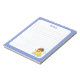 Cute notepad with an illustration of a yellow duckling wearing a colourful umbrella hat swimming on a pond in the rain, in the bottom right corner. A white writing space with blue lines on a blue background. At the top of the notepads in blue text is the word notes, this is a template that can be used as it is or replaced with your on text using the text box.