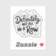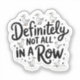 An illustration of a playful sticker with multiple sketches of ducks in various poses such as standing, waddling, and floating. The ducks are illustrated in a simple, cartoonish style. The central text reads "Definitely not all in a row," which is written in a whimsical, curvy font. The background of the text is adorned with small star-like shapes, adding to the light-hearted and fun vibe of the design.