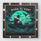 This illustration showcases a hunter in a boat amidst a foggy or misty lake. The scene is full of details like flying and swimming ducks, all rendered in a tooled leather-like style with dark neon colours. The mountains in the distance and the text "BORN TO HUNT" add to the overall atmosphere.
