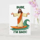 This card features a cartoon-style spiritual figure with flowing brown hair, a trimmed beard, and a gentle smile, dressed in a cream tunic with an orange sash. Centered on the front, he stands with arms outstretched as if greeting a friend, riding an orange surfboard across an emerald-green wave 🐇. The warm cream and orange tones contrast with the cool green water and a bright white background, giving the scene a crisp, modern look. The figure’s relaxed posture and kind expression add a friendly, companionable feel, like an inside joke shared between close pals 🌷. At the top, the word “DUDE,” appears in dark green uppercase letters, spaced above the character. Near the bottom, “I’M BACK!” is set in matching dark green uppercase text, anchored beneath the surfboard and wave. The wave curls in a simplified shape with white foam accents, framing the board against the open white space.
