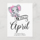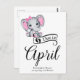 Adorable baby girl elephant with pink polka dot ears and tiny bow above ear, "Due in April" typography, and template for special message announcing pregnancy.