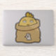 A bored yellow chicken sitting in a feed bag. Stuck? Yeah. Concerned? Not really.
